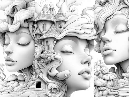 Faces House Coloring Page – Printable Coloring Page with Female Portraits (A4, Black & White)