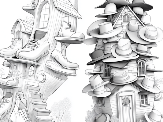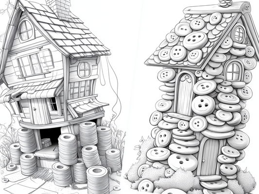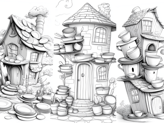 Dishes House Coloring Page – Homes Made from Cups, Plates & Jugs (A4 PDF)