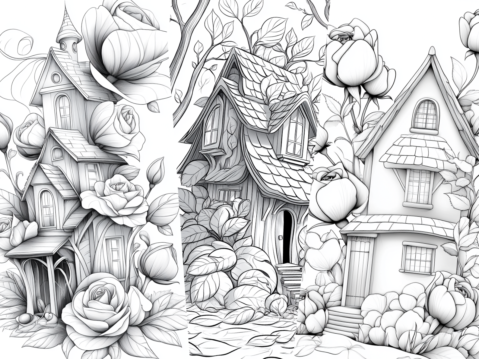 Nature House Coloring Page – Roses, Greenhouses, Leaves & Snowdrops (A4 PDF)|Wonder House